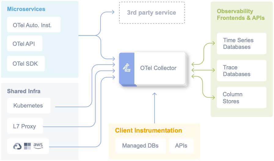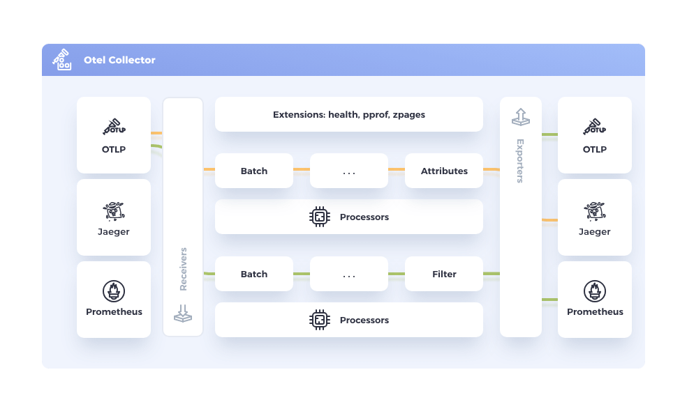 The Collector functions like a spider in a web and is documented further here. The Collector offer a vendor-agnostic implementation of how to receive, process and export telemetry data. It removes the need to run, operate, and maintain multiple agents/collectors. This works with improved scalability and supports open source observability data formats (e.g. Jaeger, Prometheus, etc.), sending to one or more backends (also called frontends in the above diagram). Collectors are complex and support multiple components, including Receivers, Processors and Exporters, as shown in this diagram: