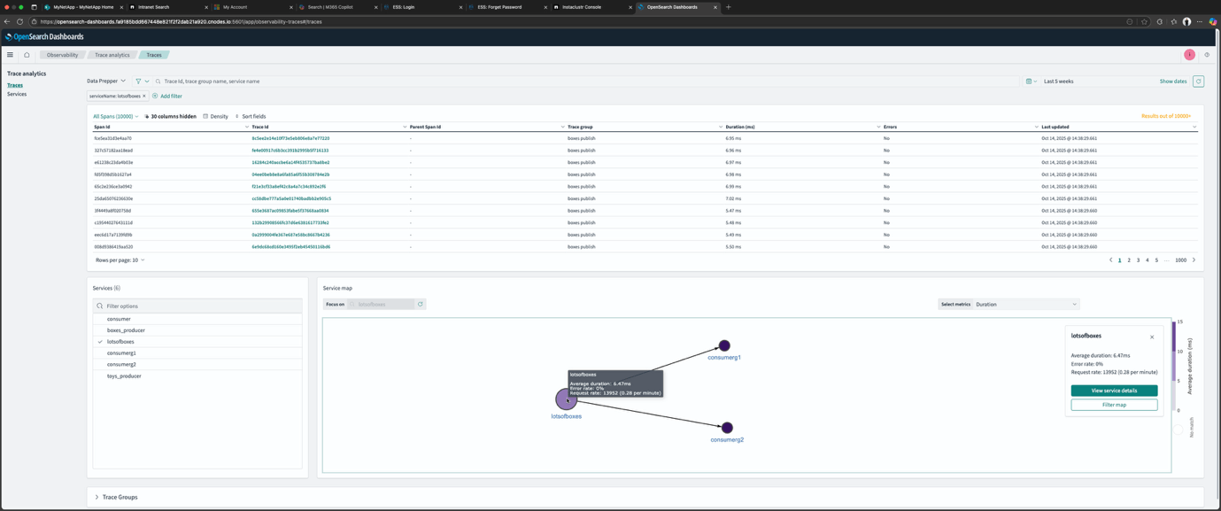 For a more interesting use case and topology, I ran a producer (service.name=lotsofboxes) writing to a topic, and two consumers in different groups (service.name=consumerg1, service.name=consumerg2) reading from the topic.
