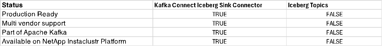 In conclusion, the following status table shows that currently, the only production-ready solution to streaming Apache Kafka data into Apache Iceberg is the Kafka Connect Iceberg Sink Connector.