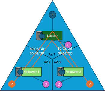 In a standard setup, you have brokers spread across different Availability Zones (AZs) for reliability. If you have a replication factor of 3, every time a producer writes a record to a leader in AZ1, that leader must replicate the data to followers in AZ2 and AZ3.