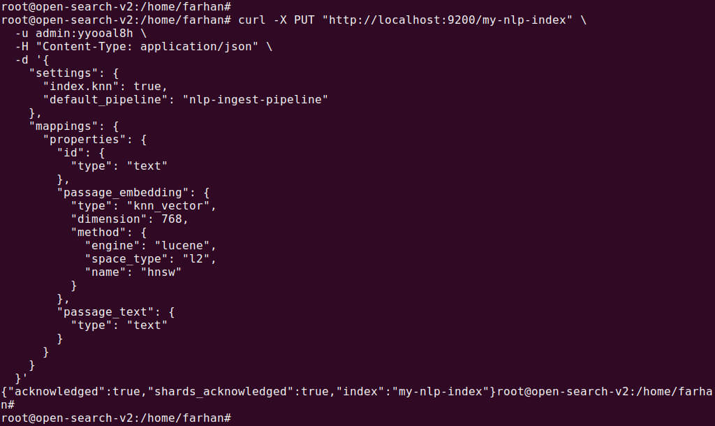 PUT /my-nlp-index { "settings": { "index.knn": true, "default_pipeline": "nlp-ingest-pipeline" }, "mappings": { "properties": { "id": { "type": "text" }, "passage_embedding": { "type": "knn_vector", "dimension": 768, "method": { "engine": "lucene", "space_type": "l2", "name": "hnsw" } }, "passage_text": { "type": "text" } } } } |