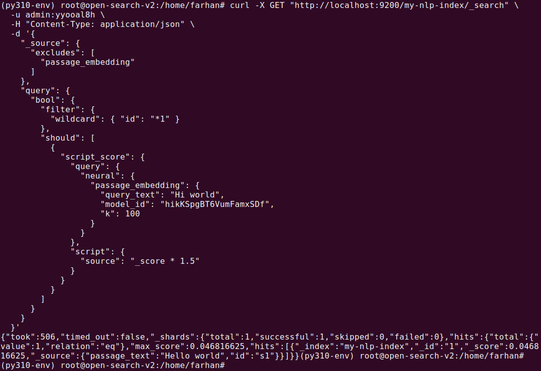 GET /my-nlp-index/_search { "_source": { "excludes": [ "passage_embedding" ] }, "query": { "bool": { "filter": { "wildcard": { "id": "*1" } }, "should": [ { "script_score": { "query": { "neural": { "passage_embedding": { "query_text": "Hi world", "model_id": "F_bMXKUDx_3FZQvMNU4D", "k": 100 } } }, "script": { "source": "_score * 1.5" } } } ] } } } |