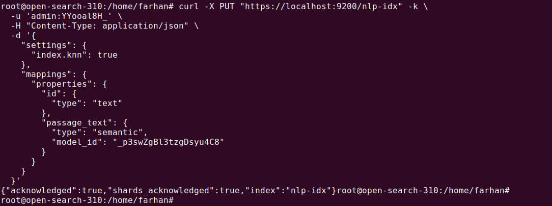 Next, create an index that will store the documents and allow vector searches. The index should be configured to use the ingest pipeline you created in Step 1. Additionally, ensure the passage_embedding field is set as a k-NN vector type, which allows for semantic searches.