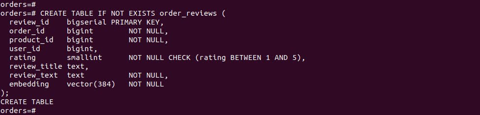 CREATE TABLE IF NOT EXISTS order_reviews ( review_id bigserial PRIMARY KEY, order_id bigint NOT NULL, product_id bigint NOT NULL, user_id bigint, rating smallint NOT NULL CHECK (rating BETWEEN 1 AND 5), review_title text, review_text text NOT NULL, embedding vector(384) NOT NULL); |