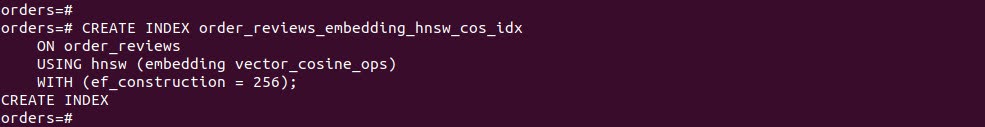 -- Full-text search index on review_text CREATE INDEX order_reviews_review_text_fts_idx ON order_reviews USING GIN (to_tsvector('english', review_text)); -- Vector similarity index using HNSW (cosine distance) CREATE INDEX order_reviews_embedding_hnsw_cos_idx ON order_reviews USING hnsw (embedding vector_cosine_ops) WITH (ef_construction = 256); |