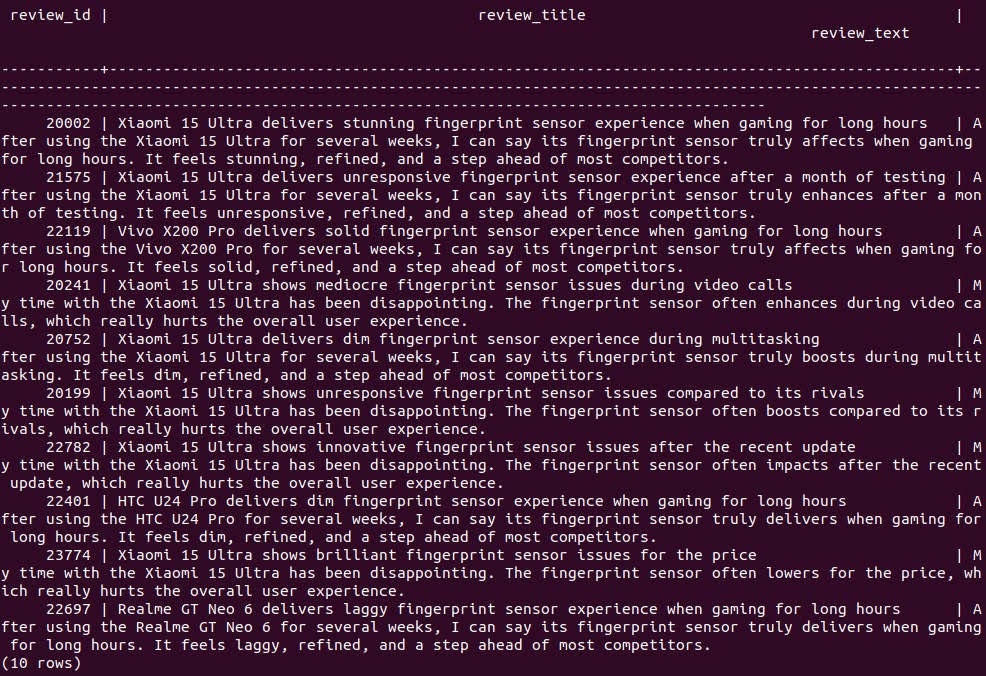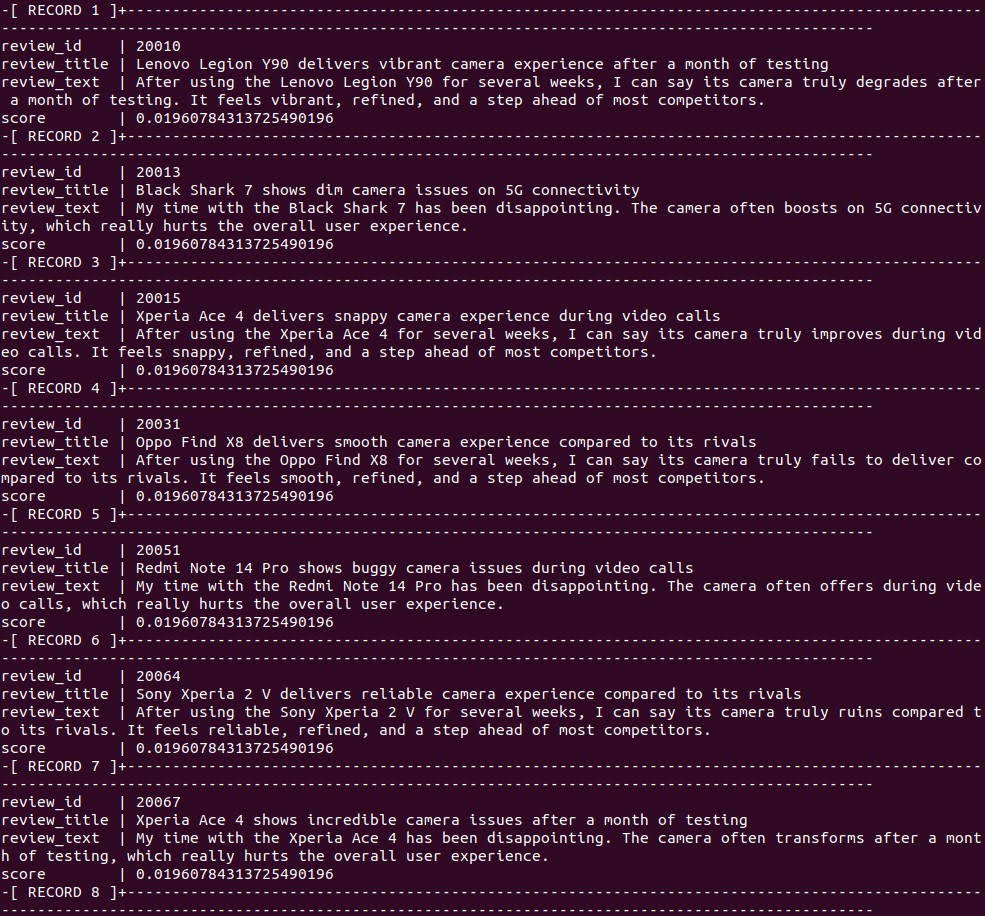 SELECT review_id, review_title, review_text, ts_rank_cd( to_tsvector('english', review_text), plainto_tsquery('english', 'camera') ) AS rank FROM order_reviews WHERE plainto_tsquery('english', 'camera') @@ to_tsvector('english', review_text) ORDER BY rank DESC LIMIT 10; |