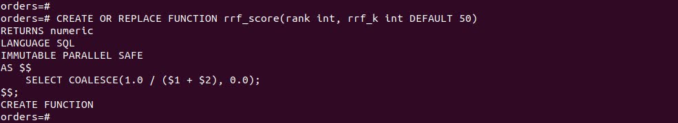 CREATE OR REPLACE FUNCTION rrf_score(rank int, rrf_k int DEFAULT 50) RETURNS numeric LANGUAGE SQL IMMUTABLE PARALLEL SAFE AS $$ SELECT COALESCE(1.0 / ($1 + $2), 0.0); $$; |