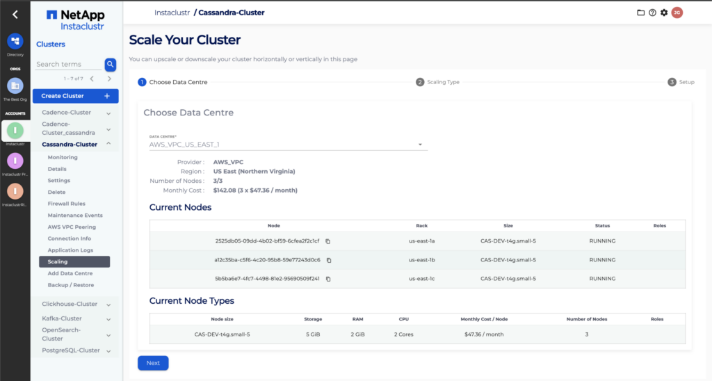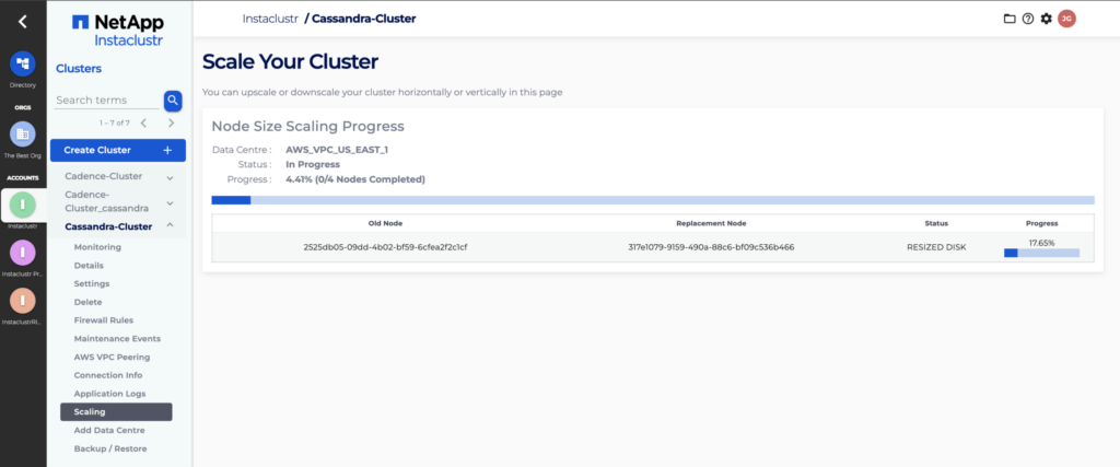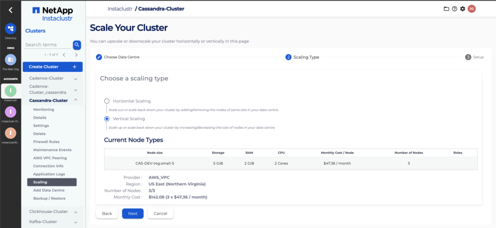 - Select your running Cassandra cluster from the sidebar menu and Click Scaling.