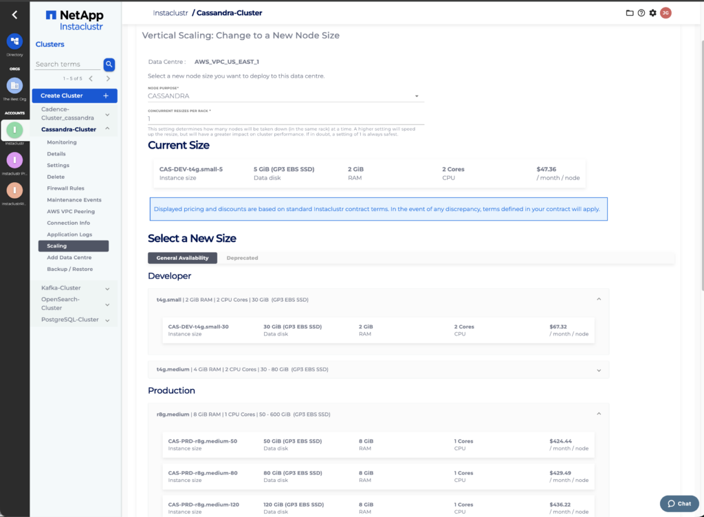 The Concurrency Factor is a number, from 1 to the count of nodes in the largest rack, that specifies how many nodes may be resized at the same time. Instaclustr will only resize multiple nodes concurrently if they are located in the same rack.After you have selected a new size, you will be shown a summary of the resize, which will include the new price for managing your cluster and any changes in the new size resources. Click on Resize to begin.
