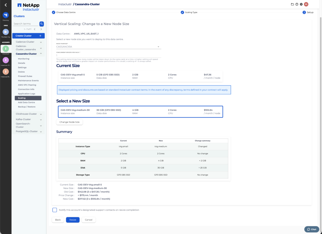 The vertical scaling page lets you select the desired target node purpose, size and specify the resize concurrency factor and notification options. The difference in CPU core count, memory quota and total monthly price are listed on the page.