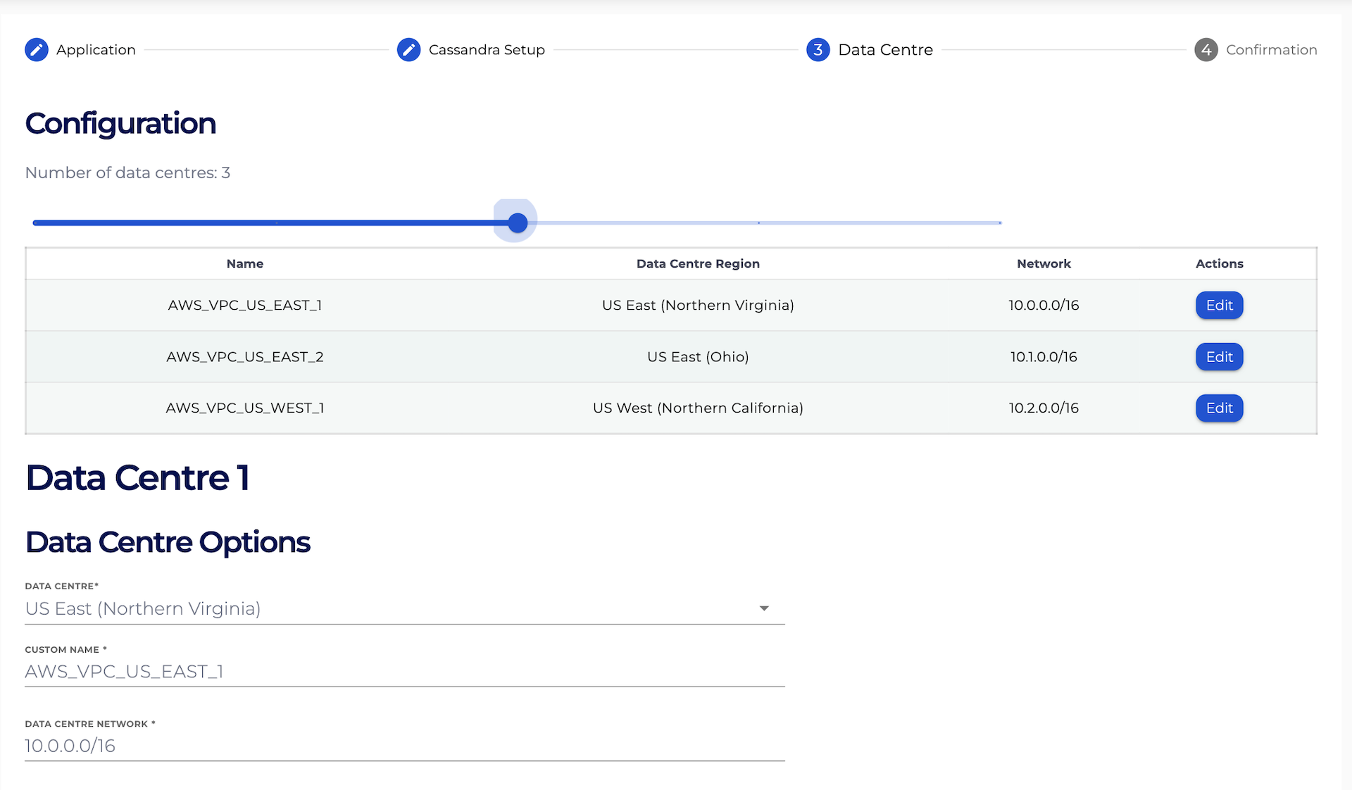 - Use the slider at the top of the Data Centre page to select up to 5 data centres when provisioning multi-DC clusters via console. To create a cluster with a single DC, leave the slider on 1 (default).