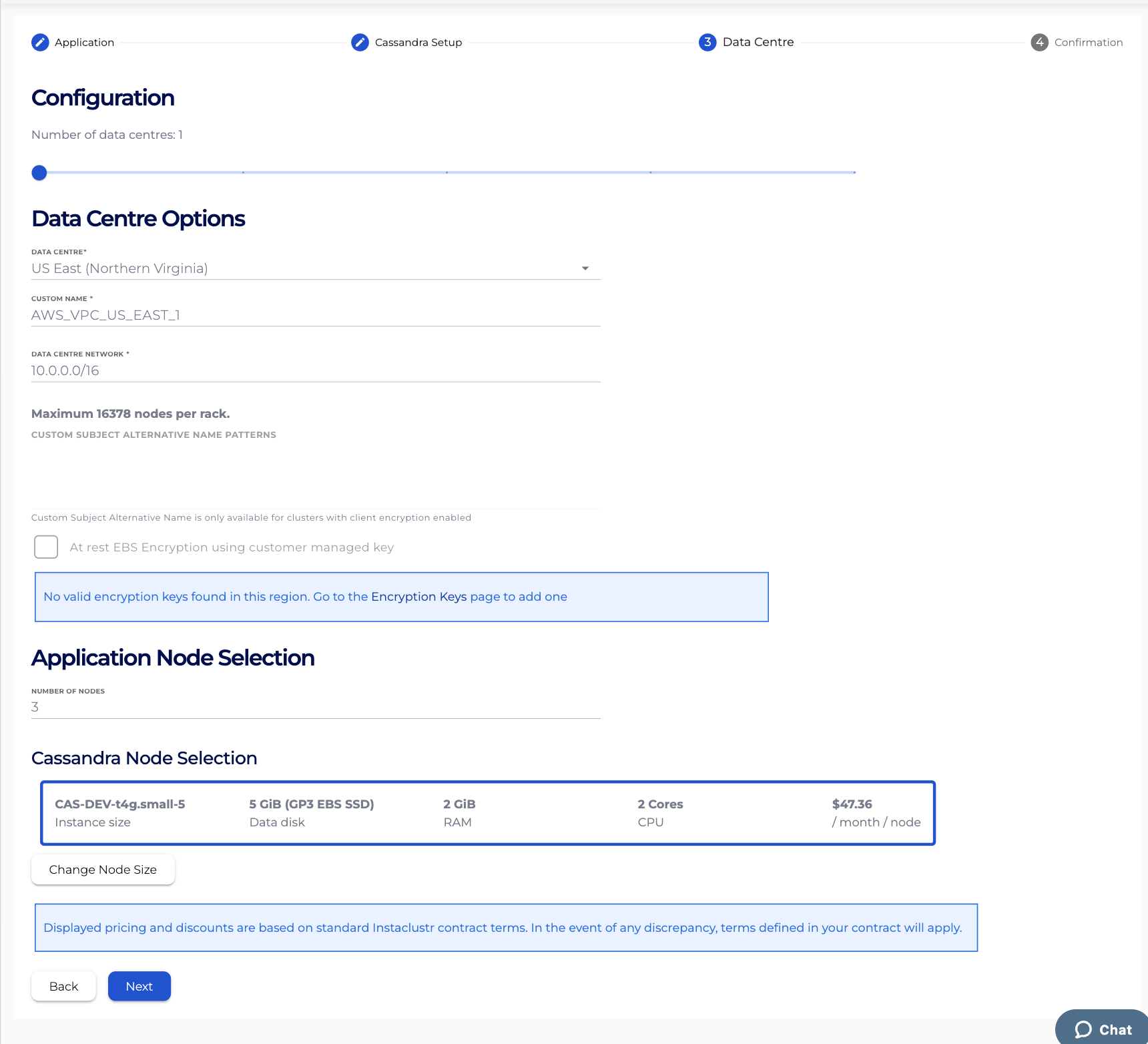 - Under the Data Centre section, select a Data Centre region, a Data Centre Network address block, the Number of Nodes for your application, and your desired node size.