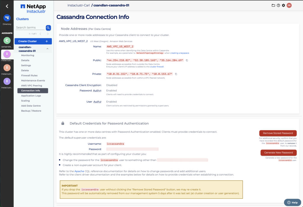 When you create an Apache Cassandra cluster with authentication enabled on the Instaclustr platform, we’ll create a new super user for you to connect to the database, referred to as the iccassandra role. The password for this role is randomly generated when the cluster is created, and stored in our system for 5 days from cluster creation, after which it is removed from our records. We recommend that you change the password for this role as soon as possible after the cluster has been created.