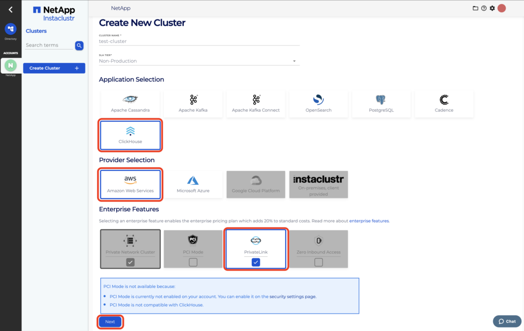 - Under the applications page, select ClickHouse as the application and AWS as the provider. Enable PrivateLink under Enterprise Features, configure any other settings as required, then click Next.