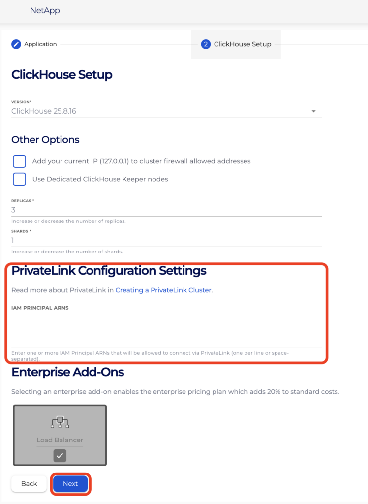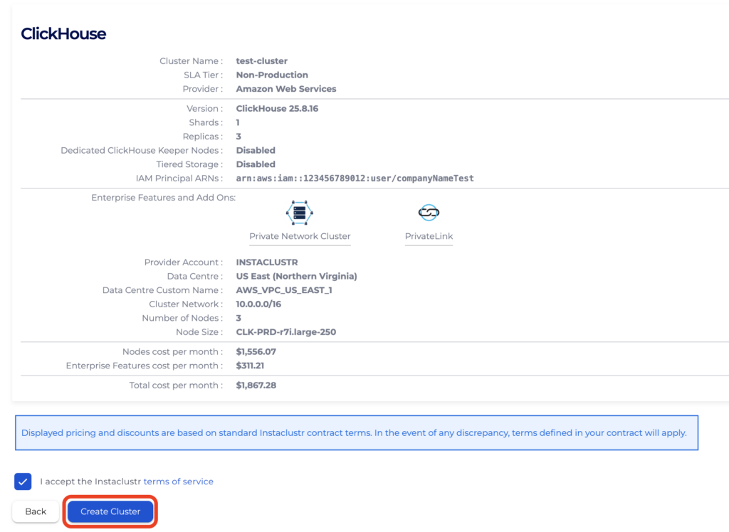 - On the ClickHouse Setup page, there is a section titled PrivateLink Configuration Settings. This section includes IAM Principal ARNs (Optional) which AWS identities are authorised to create endpoints to your cluster’s endpoint service. For example, adding arn:iam::123456789012:user/companyNameTest would allow the companyNameTest user to create an endpoint using the provided endpoint service name. You can input your ARNs now or can specify it later following the guide managing Principal ARNs once the cluster creation completes.