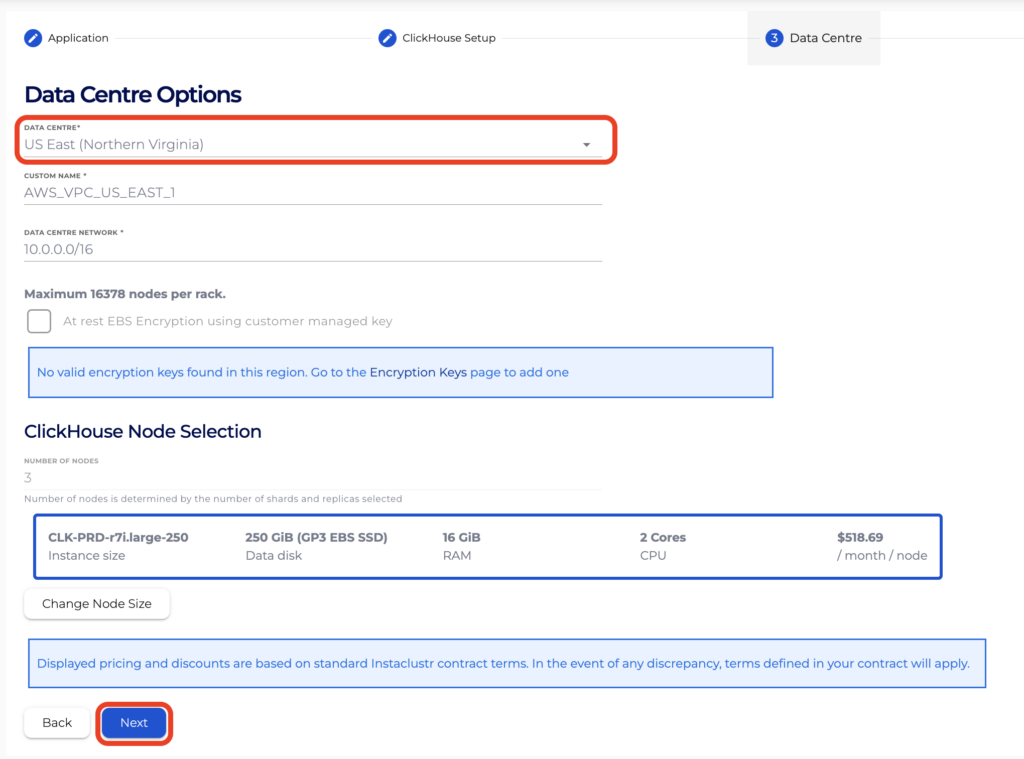 - On the Data Centre Options page, ensure your PrivateLink cluster is created in the same Region as the AWS resources from which you want to connect to it. Configure any other settings as required, then click Next.