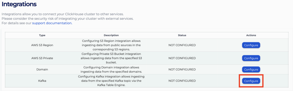 Once you have finished integrating your ClickHouse cluster with Kafka (as outlined in “How To Enable” below), you will need to manually create a ClickHouse table using the Kafka Table Engine to store the ingested data permanently (as outlined in “How To Use ClickHouse Kafka Table Engine” below).