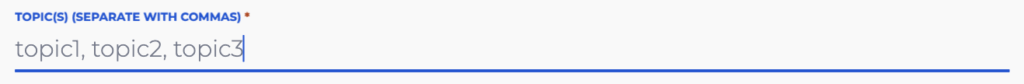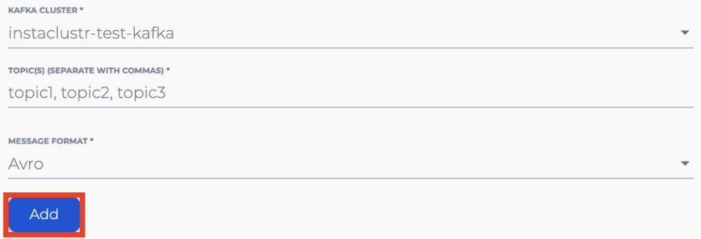 - In the textbox type in the topic(s) you wish to integrate with for your selected Kafka cluster. Multiple topics can be inputted by separating each with a comma (,).