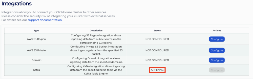 - After returning to the “Integrations” page, the status for the “Kafka” integration row will indicate that your changes are being processed and you will be momentarily blocked from accessing the page. After processing has finished, you will be allowed to re-enter the page and see the statuses for your integrations.