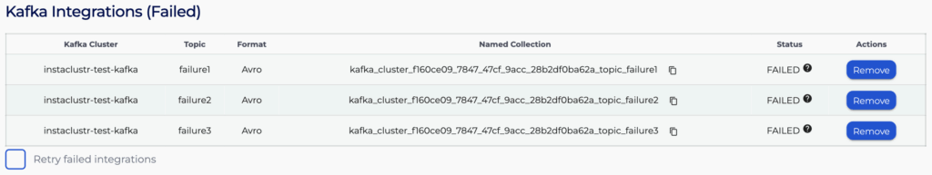 - In the event that any integrations you previously tried to add had failed, they will be listed in the “Kafka Integrations (Failed)” table. Clicking the “Remove” button for a failed integration will mark it to be permanently deleted, while checking the “Retry failed integrations” box at the bottom of the table will mark the remaining integrations to be retried.