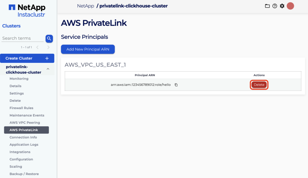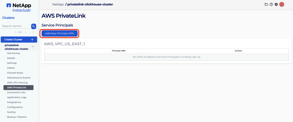 - Once yourPrivateLink ClickHouse cluster has been provisioned, you can manage Principal ARNs through the Instaclustr Console.