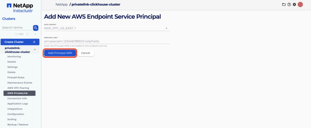 - Navigate to the AWS PrivateLink tab for your cluster and then click Add New Principal ARN. Fill in the required information and click Add Principal ARN.