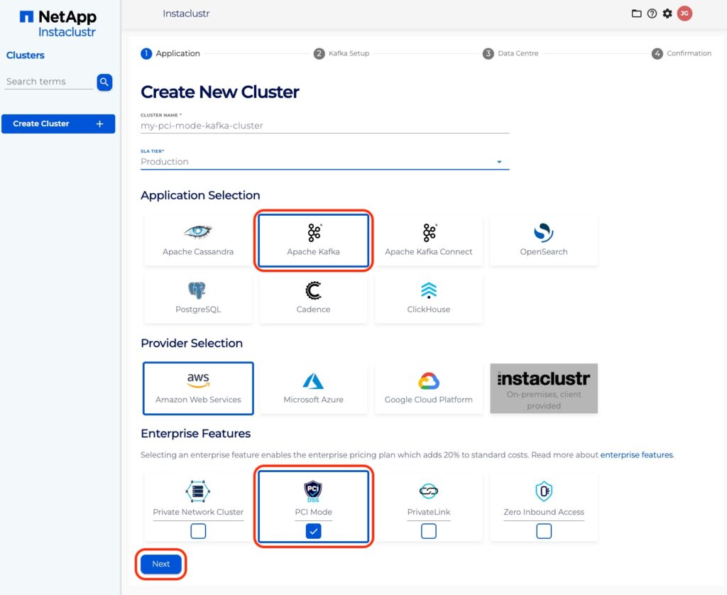 Navigate to the Create Cluster wizard and create a cluster according to your requirements but be sure to enable the PCI Mode checkbox under Enterprise features. You can refer to our support article on Creating an Apache Kafka Cluster for more information.
