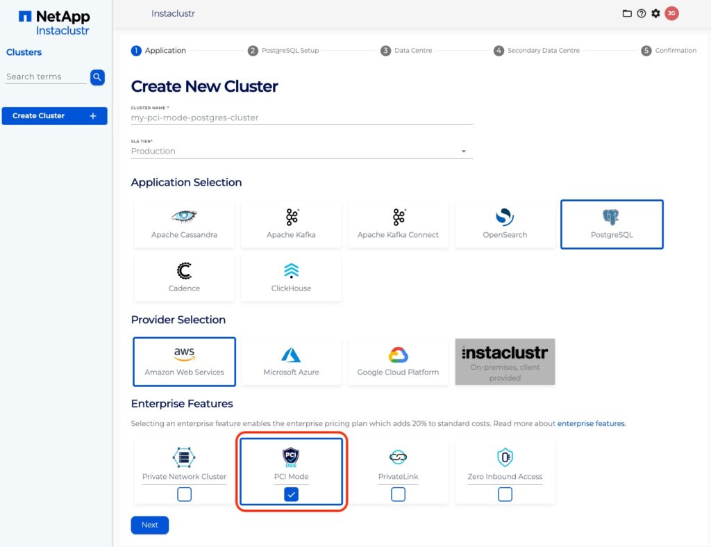 Navigate to the Create Cluster wizard and create a cluster according to your requirements but be sure to enable the PCI Mode checkbox under Enterprise features. You can refer to our support article on Creating a PostgreSQL Cluster for more information.