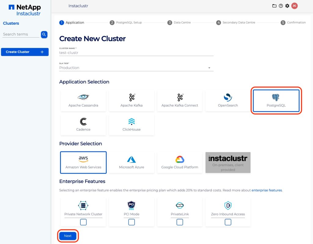 Under the Application section, enter an appropriate name for your cluster, select PostgreSQL as the base application, and choose your desired infrastructure provider. You will be able to customize specific configurations matching your performance and pricing requirements in the following sections of the wizard.
