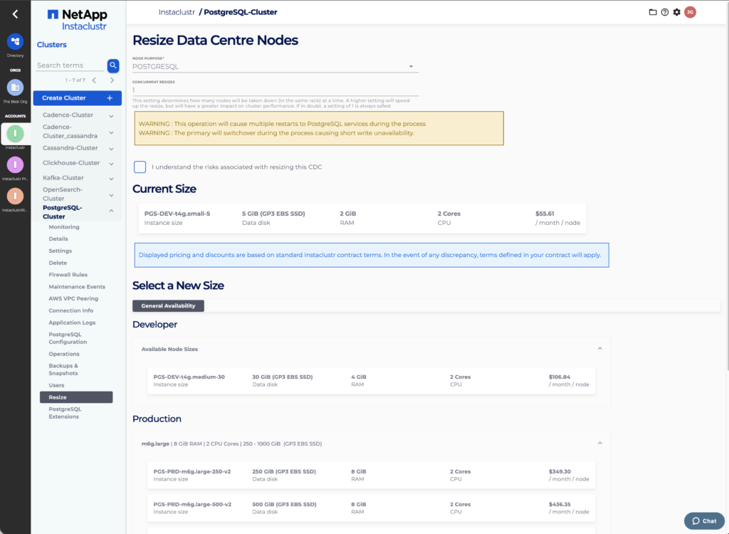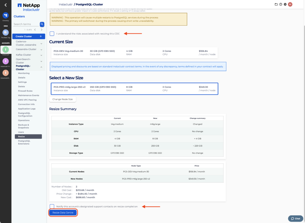 To resize data centre nodes, navigate to the Resize page for your PostgreSQL cluster.