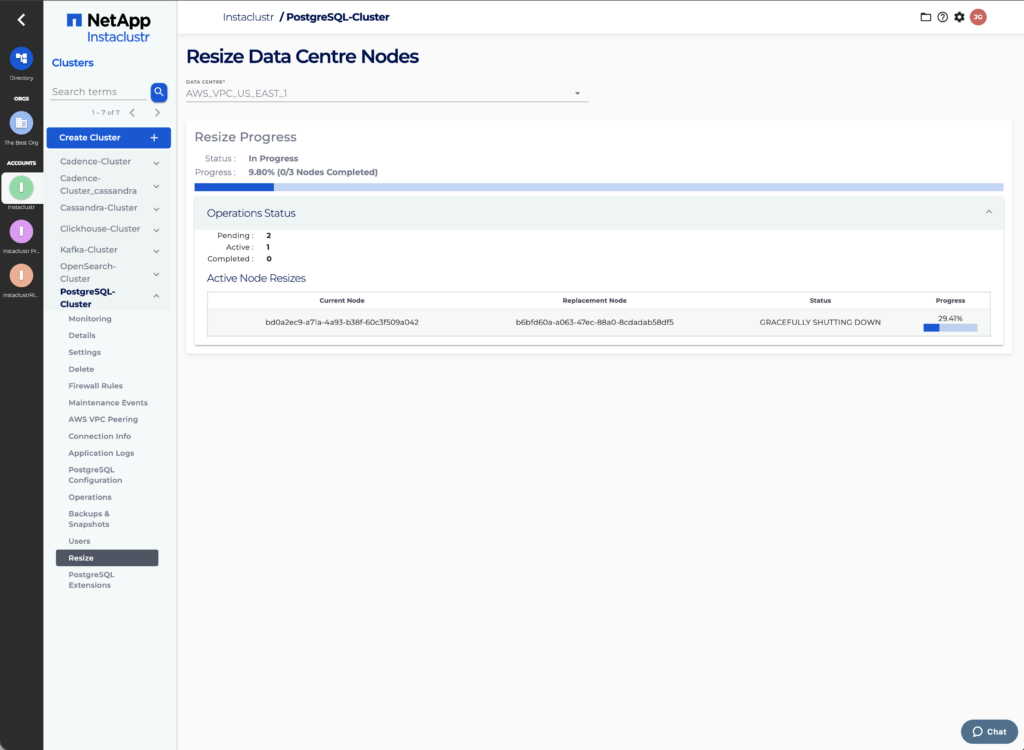 Nodes in a PostgreSQL cluster can be resized in-place via the Console, through our Provisioning API or by utilising the Instaclustr terraform provider. Moving to a new node size lets you scale the CPU core count, memory quotas as well as increase disk capacity to meet changing demands.