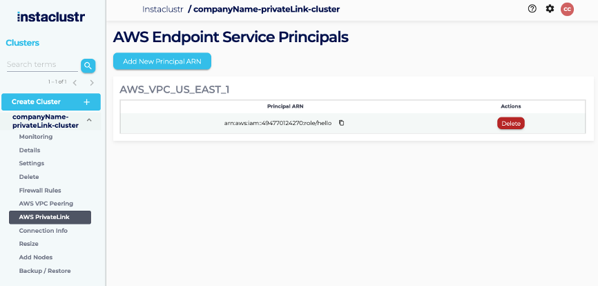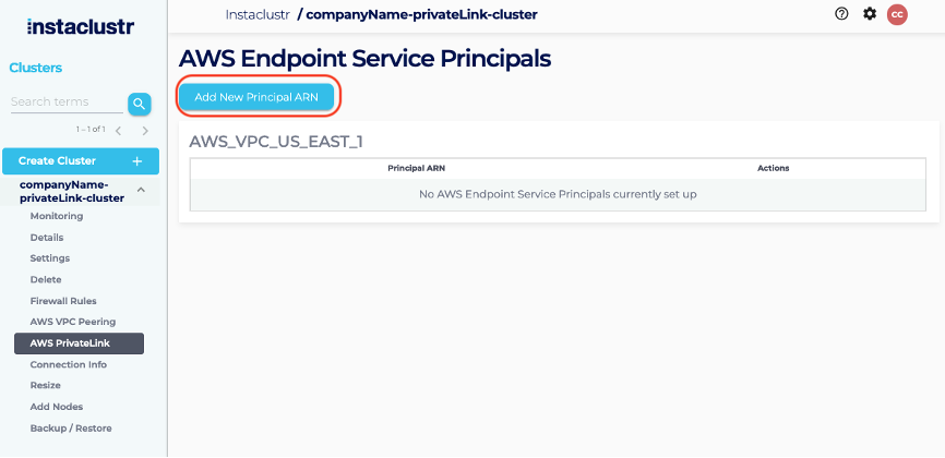 - Once your cluster has been provisioned, you can manage Principal ARNs through the Instaclustr console. Navigate to the AWS PrivateLink tab of your cluster and then click on Add New Principal ARN.