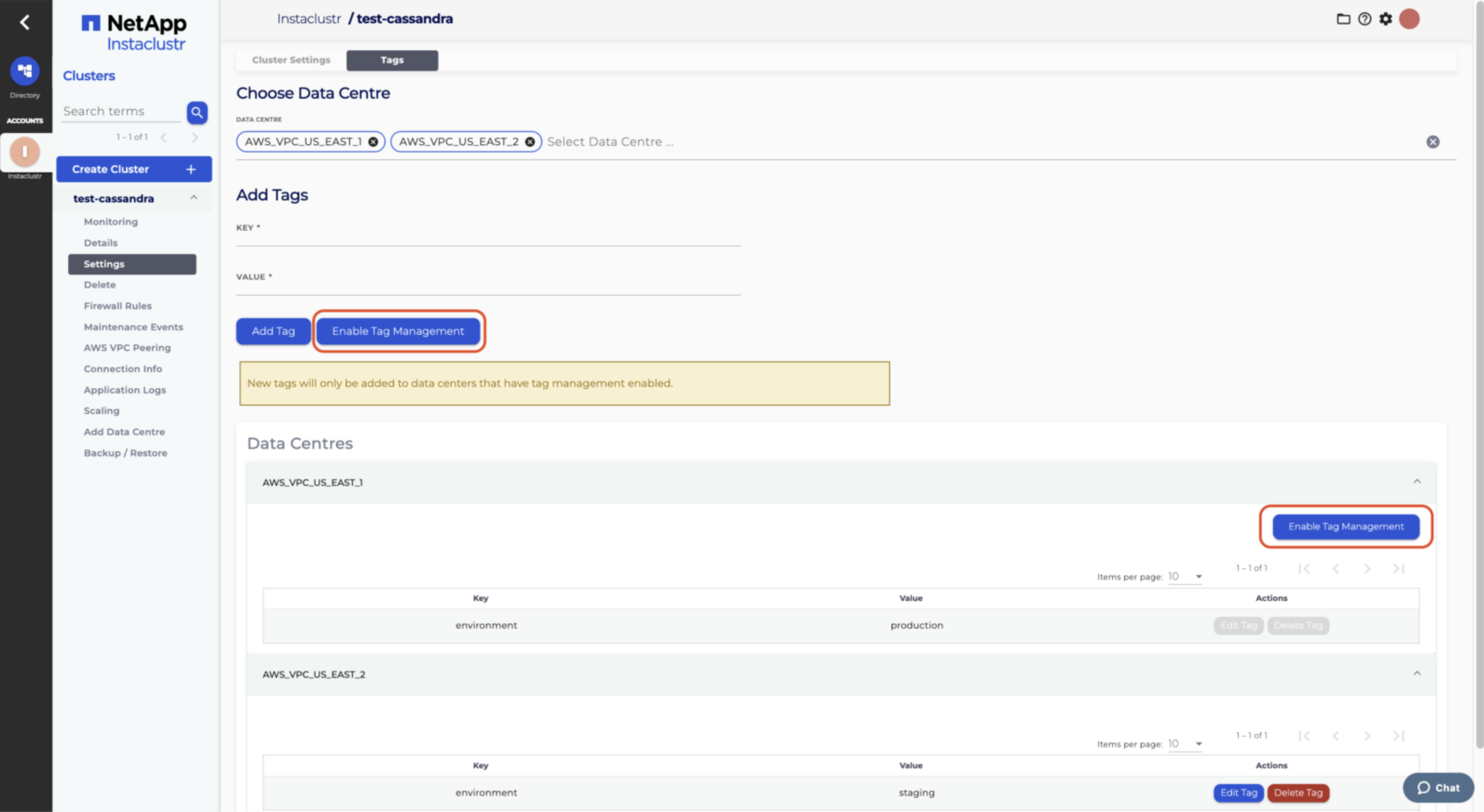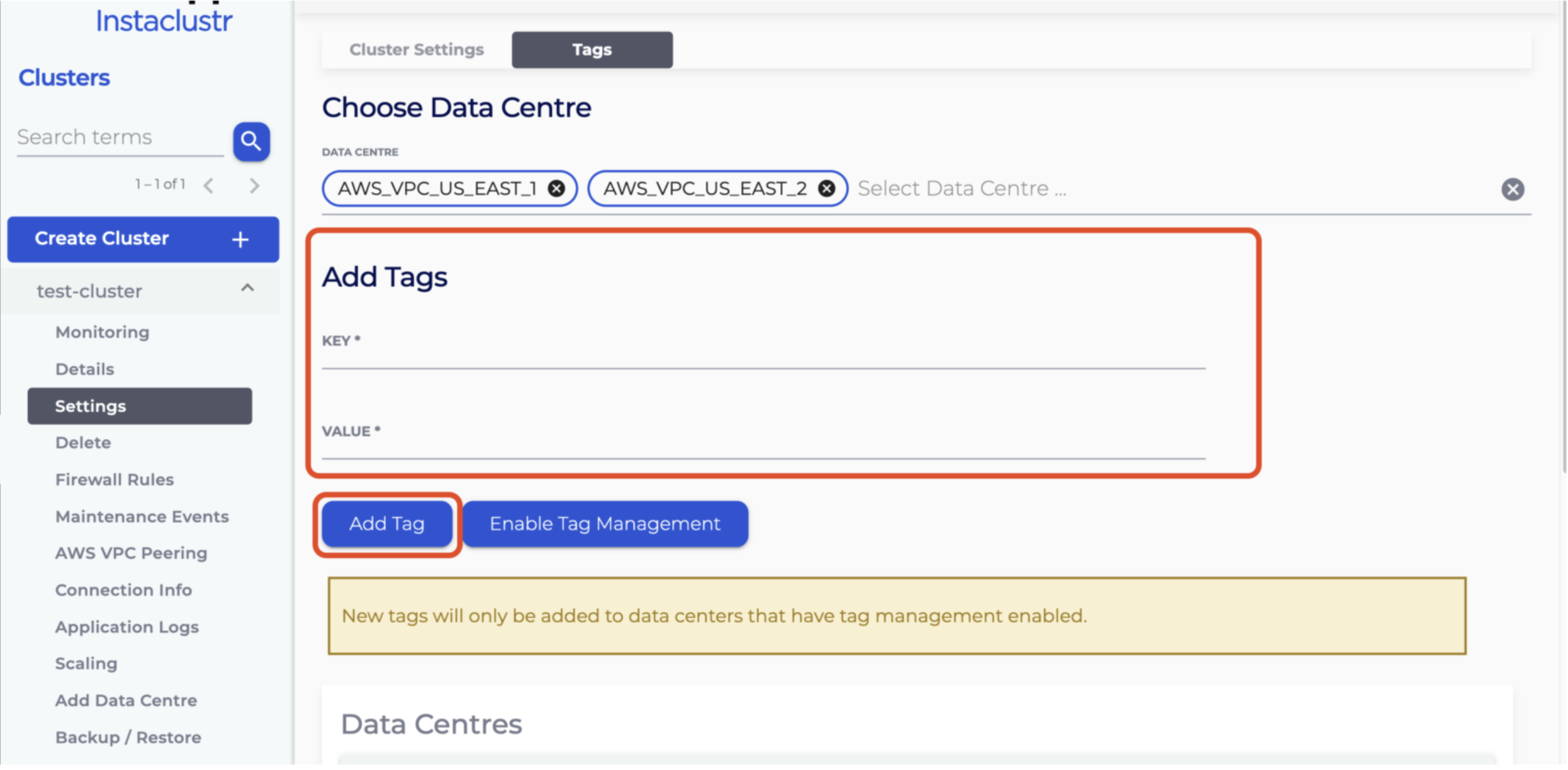 - In Instaclustr Console, select a cluster -> go to its Settings -> go to the Tags tab. Check if there is a blue “Enable Tag Management” button for a data centre. Tag Management is disabled for the data centre if it has this button.