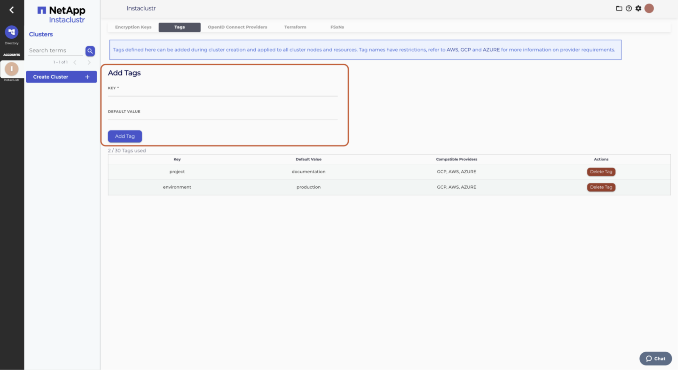 - Create a tag on this page by entering the necessary data into the input fields. Each tag consists of a key and a value. The values you set on this page will be the default options for when a cluster is created.