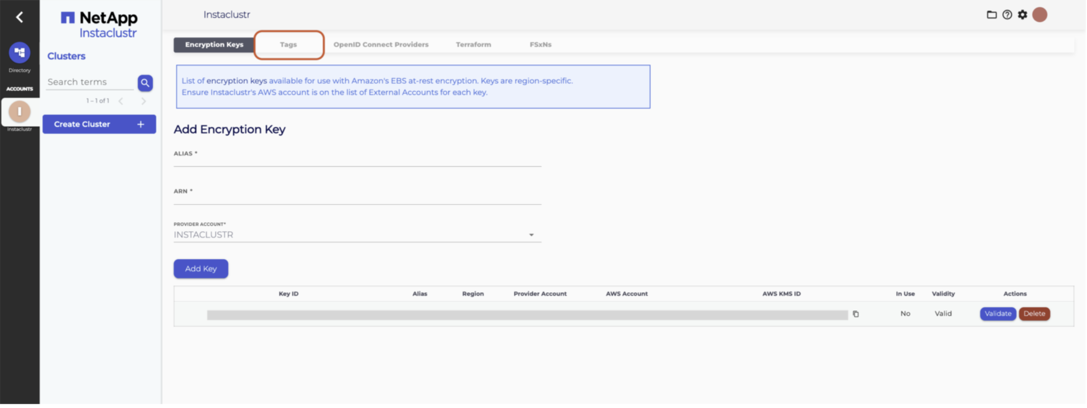 - Select the Tags tab. This will take you to a page from which you can define the tags that you would like to add to the clusters which will be created in this account.